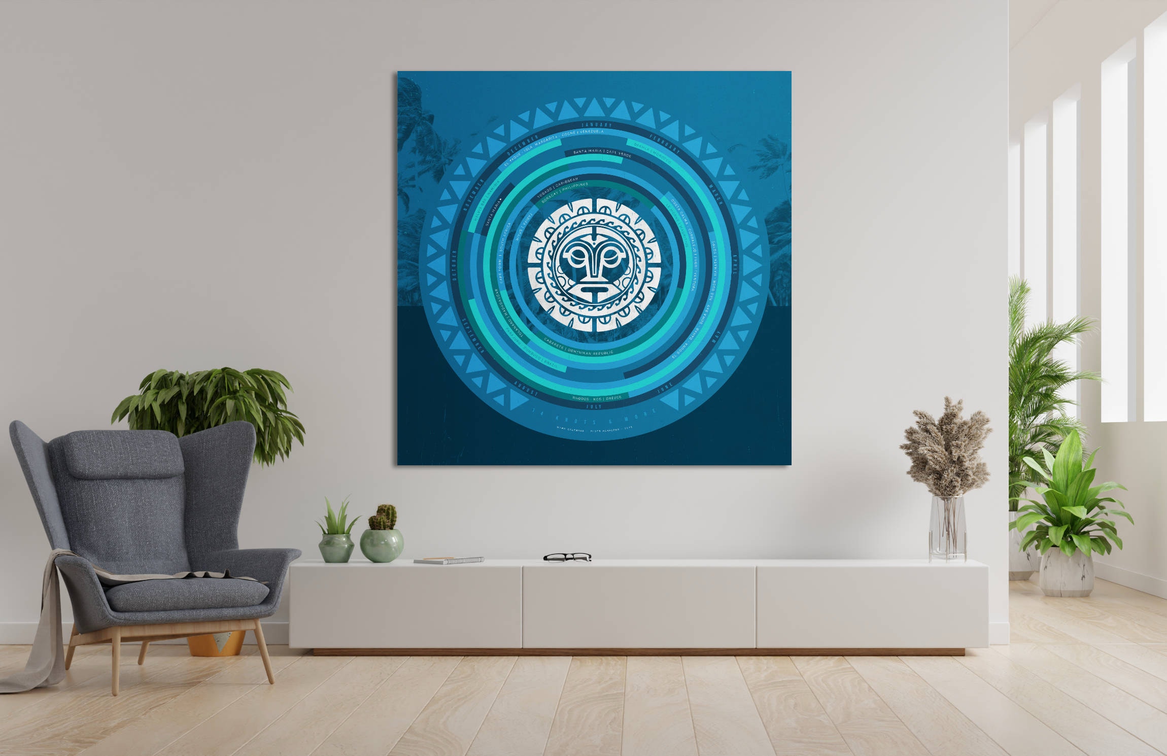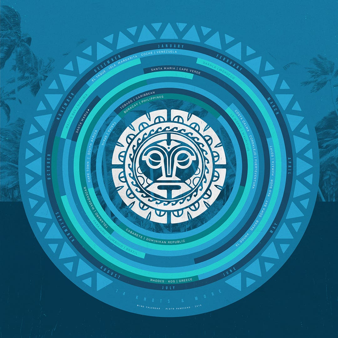 Es zeigt Monate und Regionen auf der Welt, wo durchschnittlich ein Wind von mind. 14 kn weht. Ein Kunstwerk und ein nützlicher Wegweiser für Surf-Weltreisen.