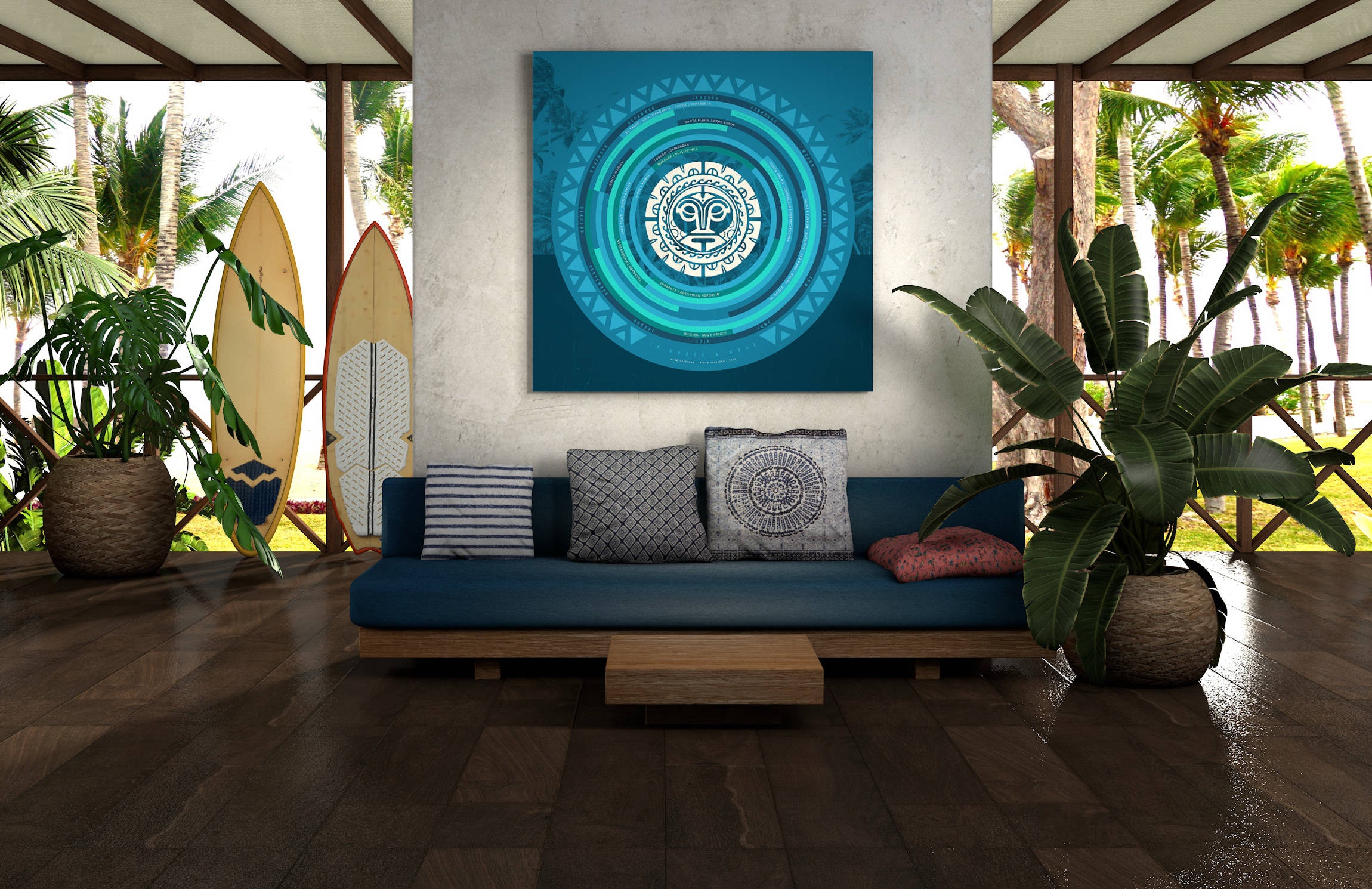 Es zeigt Monate und Regionen auf der Welt, wo durchschnittlich ein Wind von mind. 14 kn weht. Ein Kunstwerk und ein nützlicher Wegweiser für Surf-Weltreisen.